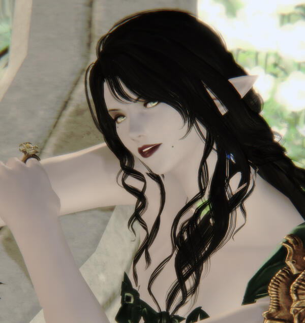 Abigail is an elezen of average height and a slender build. She keeps her long, dark hair loosely tied back or up in a bun and often wears dark make up. She has two moles, one beneath her eye and another by the corner of her mouth. Her green eyes are light enough that they seem to glow in the right light. Its obvious she prefers gowns in dark greens and black and further adorns herself in gold.
