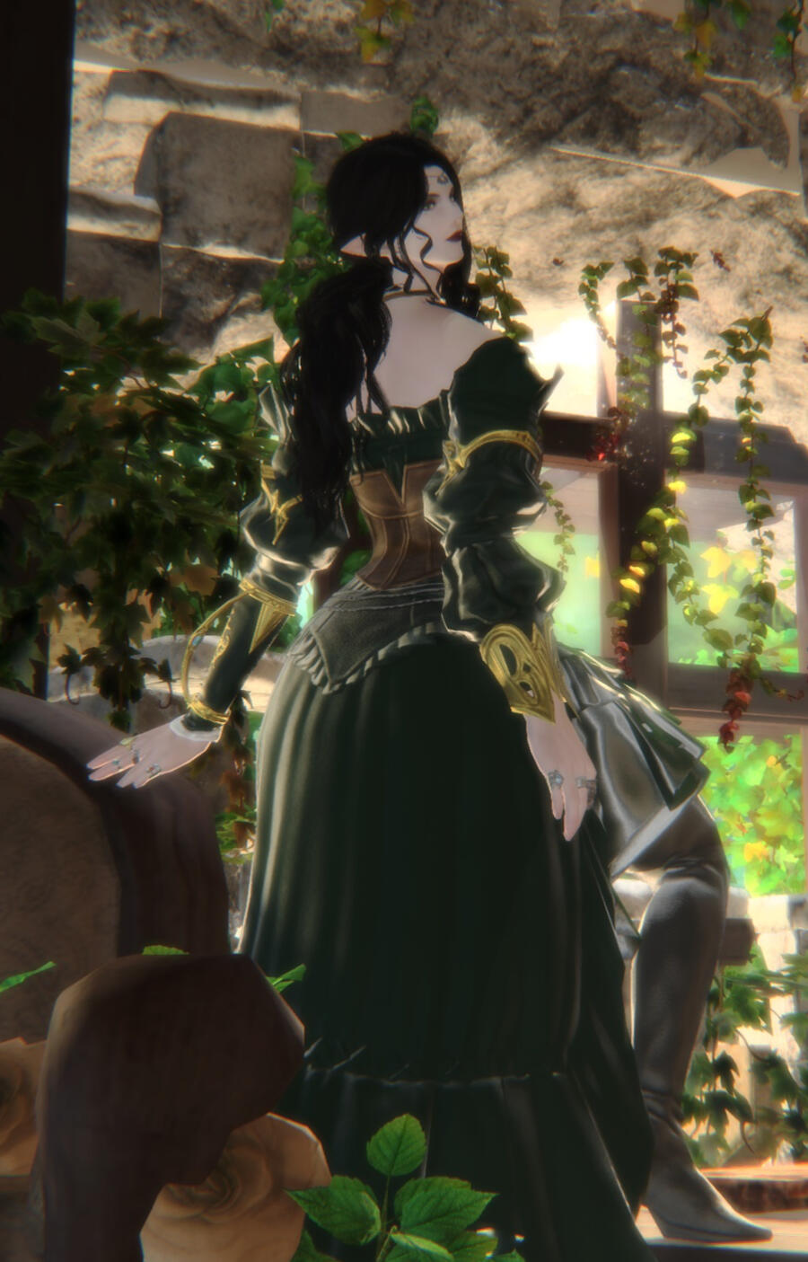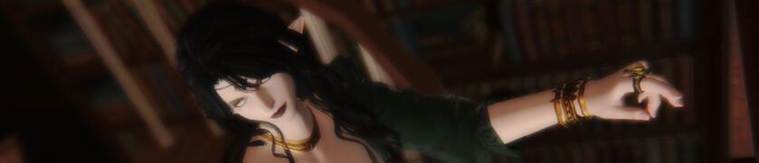 Abigail is an elezen of average height and a slender build. She keeps her long, dark hair loosely tied back or up in a bun and often wears dark make up. She has two moles, one beneath her eye and another by the corner of her mouth. Her green eyes are light enough that they seem to glow in the right light. Its obvious she prefers gowns in dark greens and black and further adorns herself in gold.